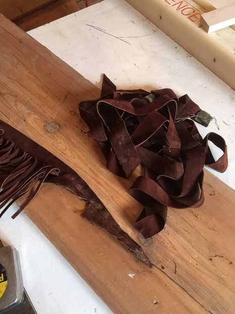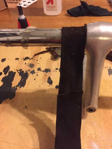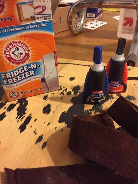 Sé lo que piensas pero hay realmente una historia muy buena por qué ahora es material de proyecto. Supongo que era un abrigo que una antigua novia había dado a mi padre conoció a mi madre y ella no era el mayor fan de él sosteniendo. También parece que la chaqueta de Dennis Hopper en Easy Rider, llevaba excepto forma menos cool en mi padre. De todos modos, me corte una manga de la capa y cortar 8-10 tiras de 1 1/4 de pulgada de él. Necesitaba 2 tiras de largo, uno para cada lado de la barra de la manija y empezó a conectar las piezas con pegamento y el bicarbonato de sodio. (Bicarbonato de sodio es un gran acelerador para pegamento, girando un tiempo de curación de 10 minutos a algo más cercano a 10 segundos). I simplemente añadió una tira fina de pegamento a un borde de la piel, espolvorear un poco de bicarbonato de sodio sobre el pegamento y presiona la otra pieza de eso. Durante 10-15 segundos y ahora tendrá una Unión que durará para siempre.