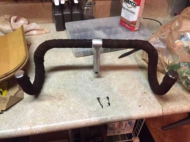 Después del "incidente de pulido de 2016" (sin entrar en detalles, hubo un incidente. Sin lesiones.), empecé a mirar alrededor para que el material adecuado envolver el manillar metálico. Fue en este punto que me acordé de que tenía la cosa perfecta - chaqueta de moto de cuero viejo de mi padre.