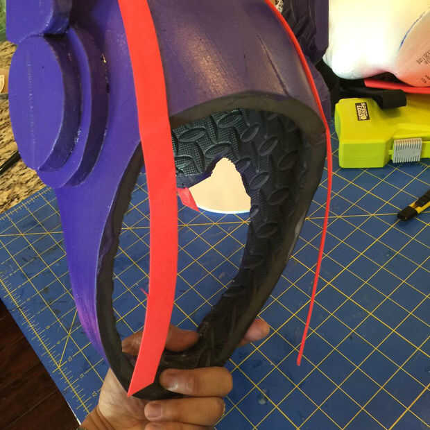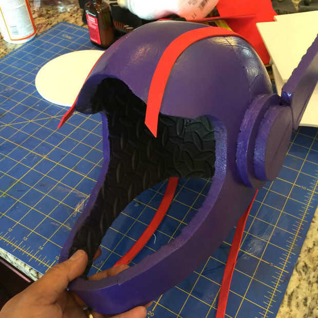 - Cortar un círculo de espuma rojo arte. Coloque en el lado izquierdo y derecho del casco con cemento de contacto.