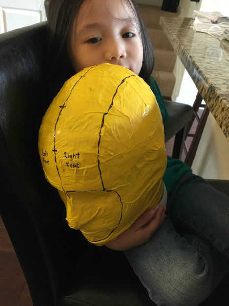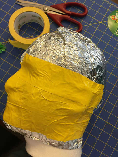 - Comience usando la cabeza de maniquí de styro (o cabeza de su hijo si la cabeza de maniquí es demasiado pequeña) y envolver la cabeza en papel de aluminio. No enrolle el rostro de su hijo con papel de aluminio! La impresión importante necesita son la parte superior, la barbilla y detrás de la cabeza.