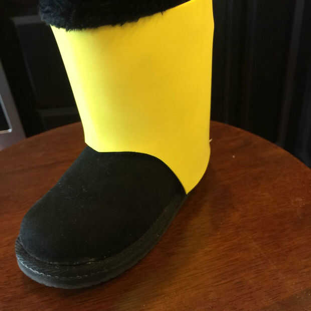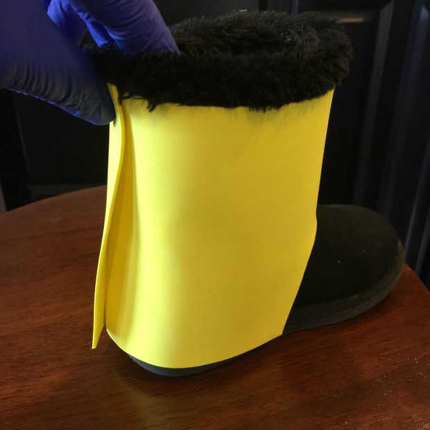 - Corte espuma amarillo según la circunferencia. Corte un pedazo de la espuma que sale los pies de la bota.