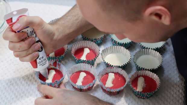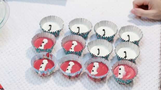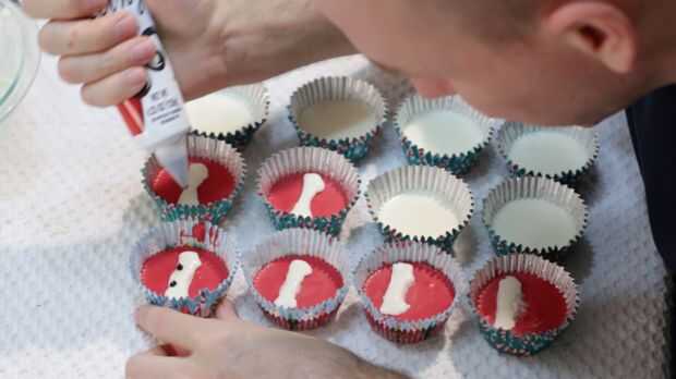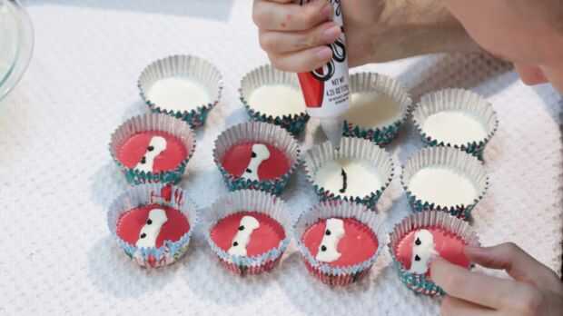 Ahora tomamos nuestro hielo negro y poner ojitos de todas las tazas de mantequilla de maní. En los blancos, agregamos una línea que va de un ojo al otro.
