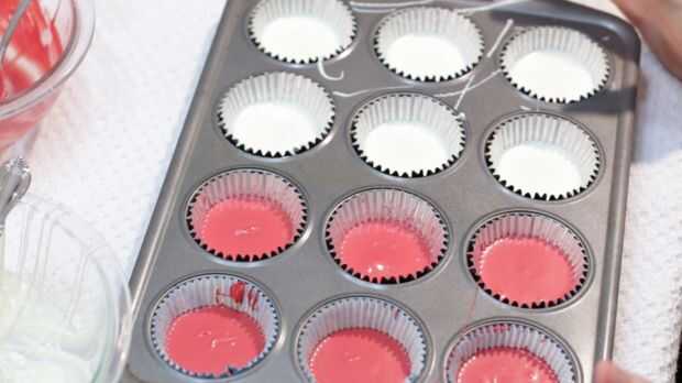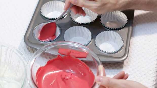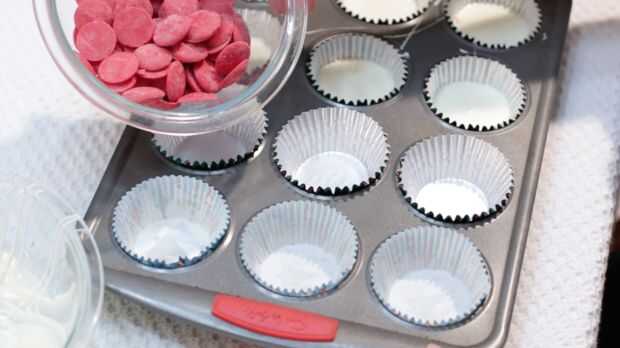 Ahora vamos a repetir que todo el proceso con el caramelo rojo se derrite, esto será la base para la Baymax en la mirada de la armadura. 1. derretir candy melts 2. Añadir una capa inferior a las tazas de papel. 3 agregar el disco de mantequilla de maní o medallones. 4 tapa de la parte superior con el caramelo rojo más funda. Una vez haya terminado, poner todo en el refrigerador durante unos 20 minutos para que el chocolate puede establecer.