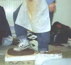 La losa fue cuidadosamente montada y un movimiento 'pisando uvas' fue empleado, teniendo cuidado de no para excavar en los talones o los dedos del pie como el espesor de la losa de una constante es lo que estaba destinado.