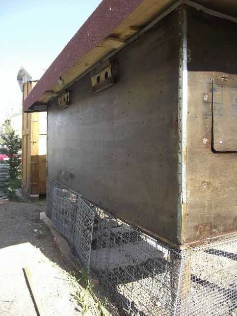 Como se eleva nuestra coop quería el alimentador que debajo de la parte cubierta para mantener los alimentos secos. Como yo estaba pensando en montar la parte de "barril/tolva" fuera de la carrera decidí a fijarla a la pared posterior de la cooperativa, con los tubos que serpentea en el funcionamiento a través del alambre del pollo.