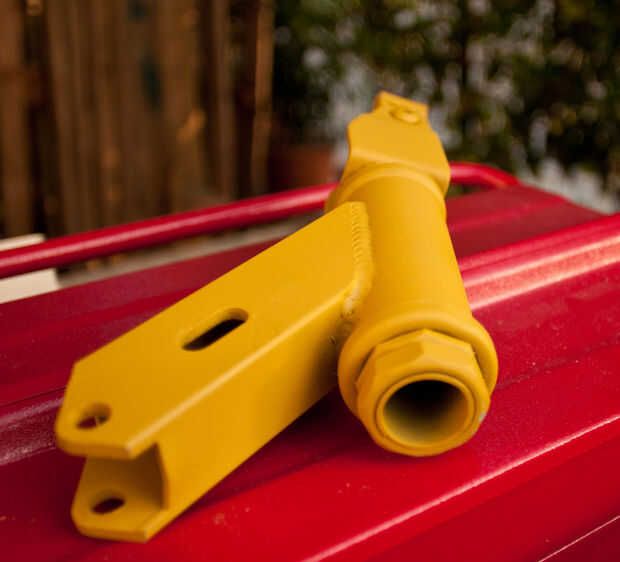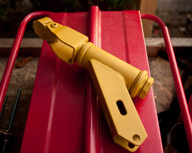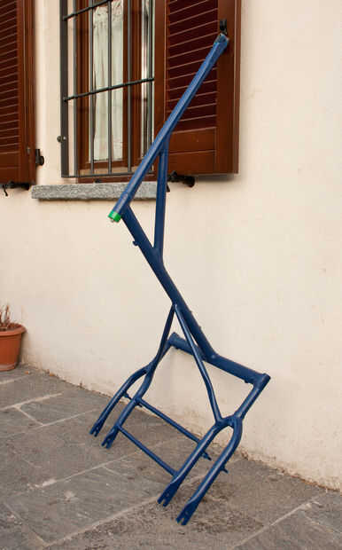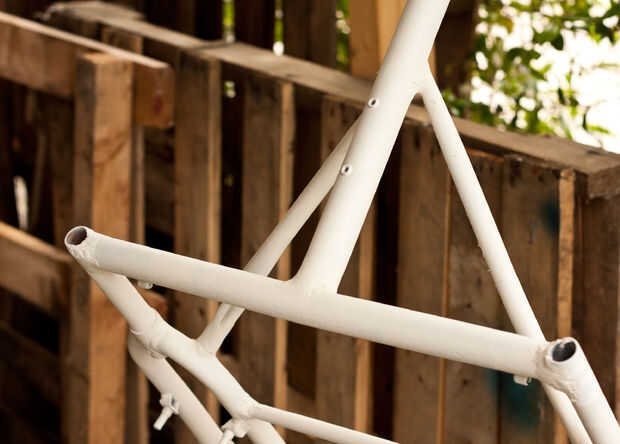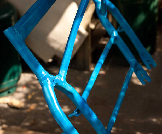Pintamos el marco con una pintura blanca de spray, luego agregamos la luz (que no era tan genial) y capas de azul oscuras. Optamos por un tinte ocre para el scooter en kicker conjunto. Pintura en la articulación de rotación no afecta su comportamiento, pero debe cubrir el anillo del tubo de asiento, por lo que para manejar sin arruinar la pintura.