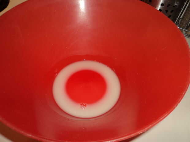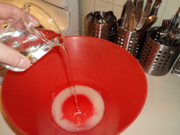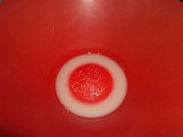 1. Añadir la levadura en agua tibia en un recipiente grande y revuelva hasta que se disuelva.  Dejar reposar 10 minutos hasta que todo lechoso