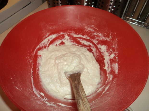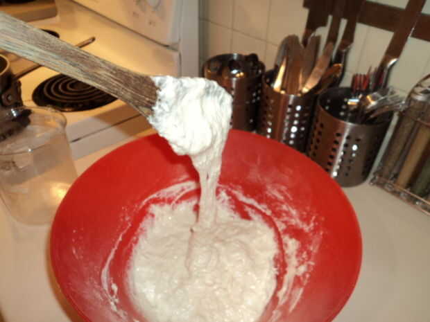 2. Añada el agua restante y luego la harina 1 taza a la vez.  Agitar durante un par de minutos.  Si su muy rígido, agregar otro 1/8 taza de agua.  Esto debe hacer un lío pegajoso goopy grueso agradable!  Que es lo que quieres.