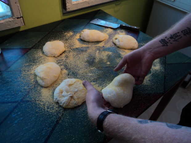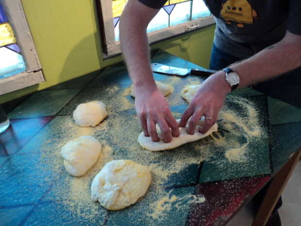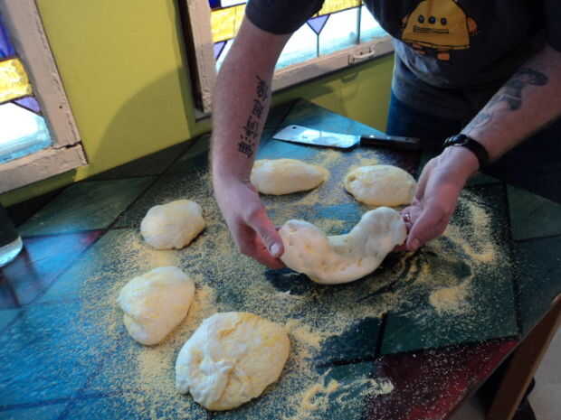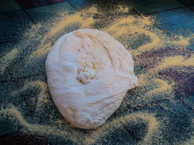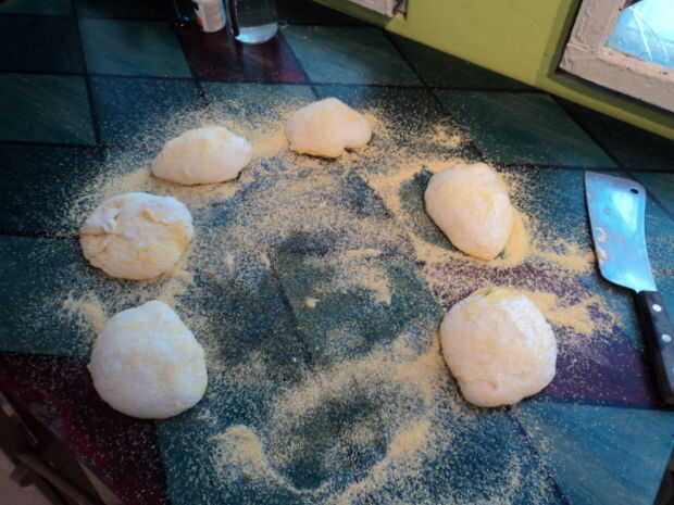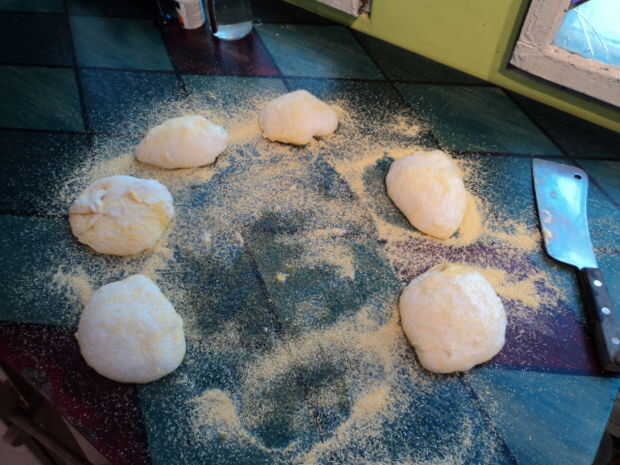 - Volcar la masa sobre la harina de maíz y dividir en 6 porciones