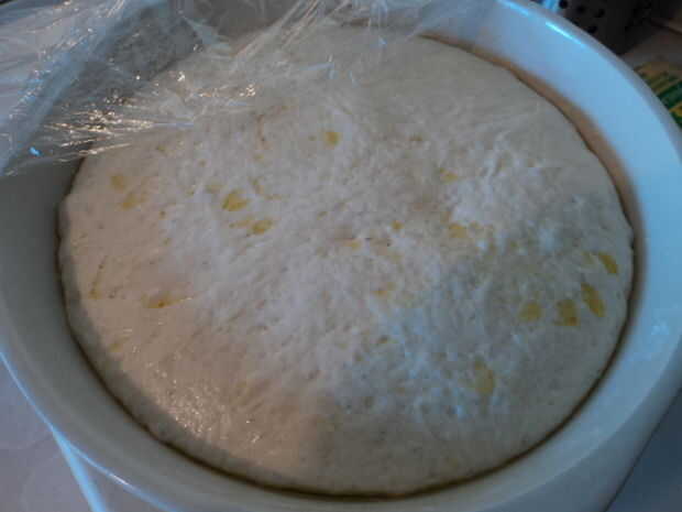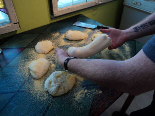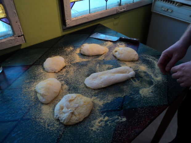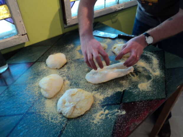 - Inserte suavemente sus manos en la masa hasta sobre el primer nudillo, levantar la masa y estirarla suavemente en forma oblonga. Caer duro sobre la superficie de trabajo.