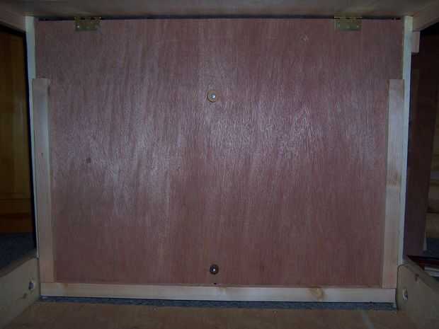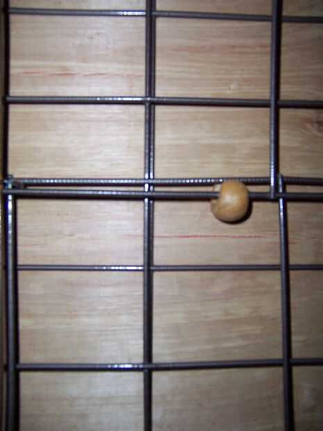 Subió con una manera muy sencilla para asegurar el material de la jaula a la madera contrachapada mientras su doblado para arriba.  Usé un gancho de madera para apoyar el doblado para arriba de la jaula, unido a una perilla en el otro lado de la madera contrachapada.  Cuando quiera la jaula para abrir, simplemente gire la perilla, que convierte el gancho en su posición de apoyo.