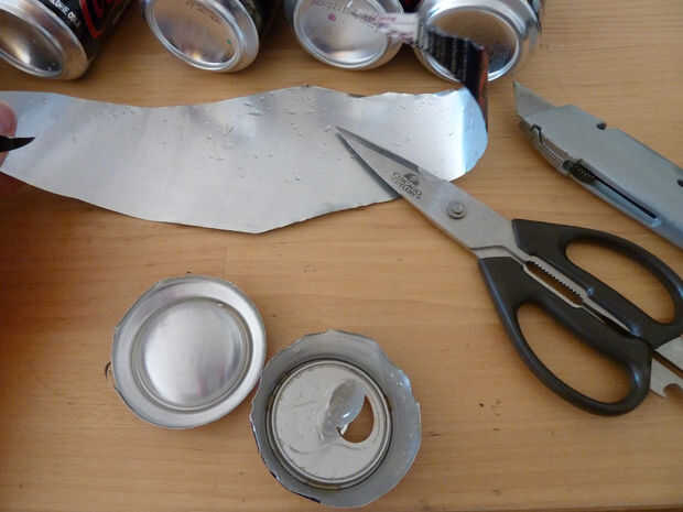 Primero corté las tapas y fondos de las latas de refresco limpia con el cuchillo.