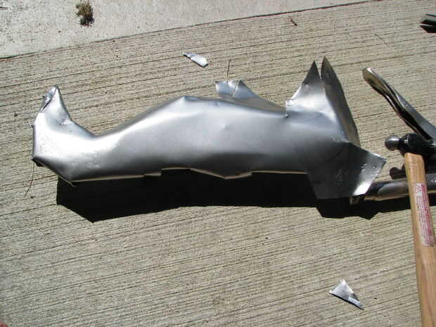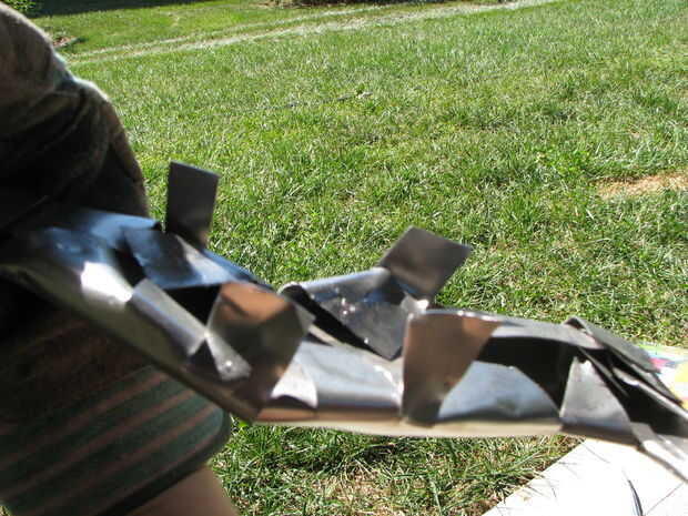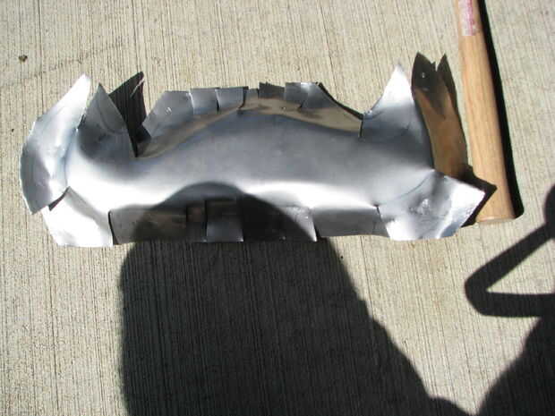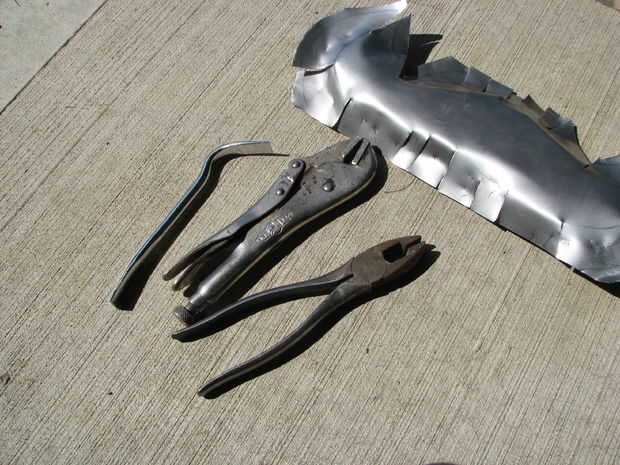 Esta es una parte bastante fácil. Sólo agarra un ala del metal con los alicates y girar las pinzas hacia atrás. Una vez que las pinzas son paralelas con el resto del metal, tire un poco. Esto debe crear una simple curva hacia atrás. hacer esto para todas las alas pequeñas del metal. Entonces, coge el martillo y un martillo en el interior. Esto asegurará que permanecerán en el y no protruyan hacia atrás demasiado. Deja las porciones finas que corta para colocar sin tocar o tire de ellas derecho hacia atrás y no en como los otros.