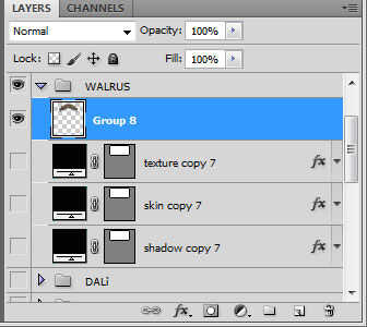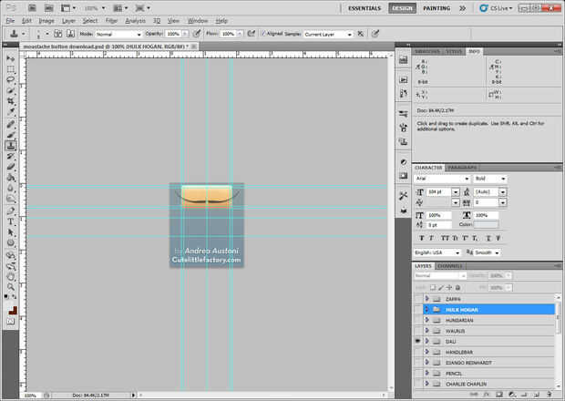 Una vez que haya seleccionado un bigote, haga clic en el triángulo junto al grupo a ampliar las capas. Haga clic en el globo ocular para la textura, la piel capas de color y sombra para que sólo el bigote es visible. Debería ver los cuadros "fondo de transparencia" detrás del bigote. Si no es así, asegúrese de que las capas de texto y fondo en la parte inferior de la ventana de capas son a invisible.