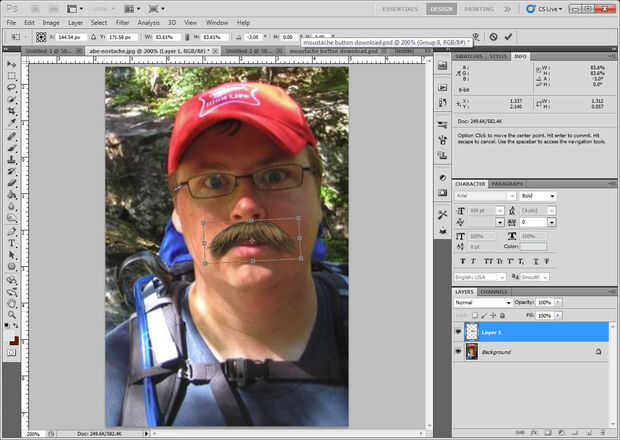A continuación, seleccione Edición -> Transformación libre (Ctrl-T) y utilice las asas a la medida el bigote correctamente. Mira algunas fotografías de personas bigotudas si tienes problemas para conseguir la escala correcta. También puede girar el bigote si la cabeza del sujeto no es bastante nivel. Una vez que estés satisfecho con el tamaño y la posición de su bigote, pulse enter (o el icono de marca de verificación en la barra de herramientas) para aplicar la transformación.