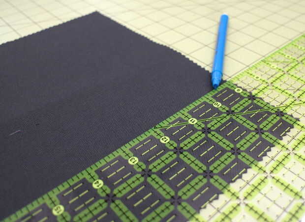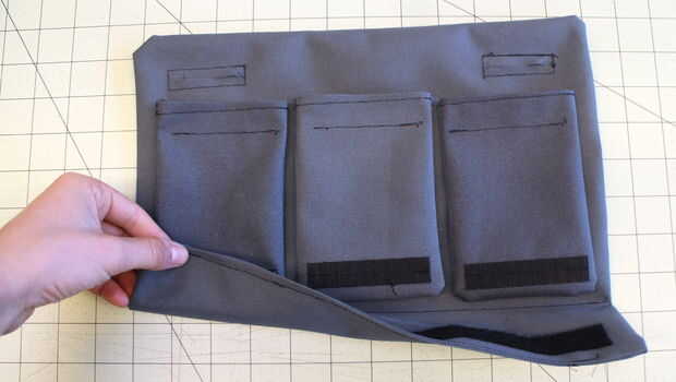 Coser una línea a través de la bolsa según lo indicado por la línea azul en los patrones del panel. Puede hacerlo antes o después de coser los paneles juntos. La solapa de velcro que hace que este pliegue finalmente se plegará sobre el cableado eléctrico.