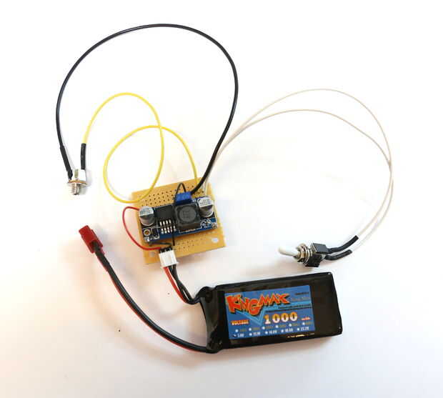 Ajustar el protoboard mini doble por la mitad para hacer un 1.75" x1.75" protoboard. El convertidor del buck LM2596 DC-DC al centro de la Junta de la soldadura. 1 x 3 pines header macho a la esquina inferior izquierda de la Junta de la soldadura y utilizar un par de alicates para doblar las patas para que sean paralelas a la superficie de la Junta. El pin más cercano al borde de la Junta será el pin de alimentación, no se utilizará el pin central y el otro pasador de extremo será tierra. Soldadura cables de la clavija de alimentación al + en el pin en el convertidor del buck y el conector de tierra en el pin en el convertidor buck. Ver el diagrama del circuito incluido aquí para más detalles.