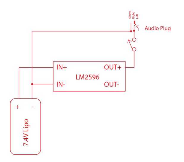 Soldar un extremo del interruptor para el perno hacia fuera + en el convertidor buck y el otro extremo al conector de sonido. Soldar el cable de audio conector restante a tierra. Conecte la batería en las patillas de la cabecera que cable rojo de la batería es más cercano al borde de la Junta.