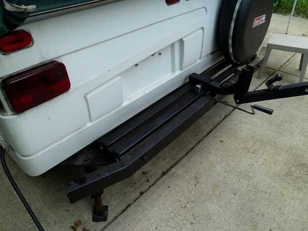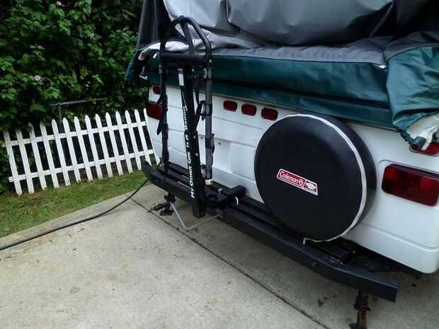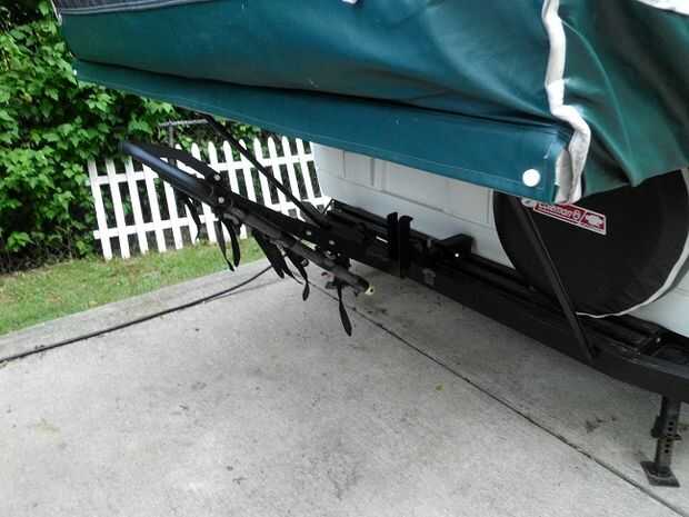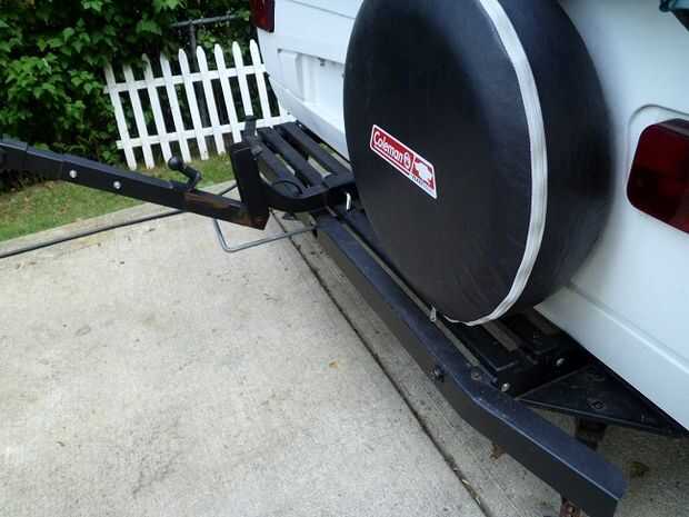 No puede irse de campamento sin bicicletas familiares! Usando un comprado un portabicicletas, fabricar un receptor para la parte trasera de nuestro camper emergente que va a llevar 4 bicis. Todos los componentes para la fabricación de este permanecen en lugar durante la instalación, camping y tomar hacia abajo. Planteé la llanta de repuesto un poco y se sienta en la plataforma del receptor, alargó la manivela para que la rejilla puede permanecer en su lugar, pliegues de estante de bicicleta hasta claro la saca de la cama. Si el estante de la bici debe poner en el carro para viajar, solo sacar el pin del receptor y listo!