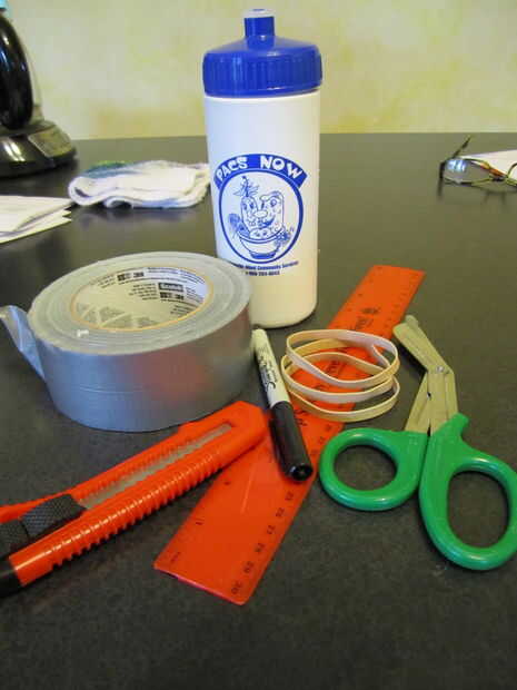 Las cosas que usted necesitará para completar este proyecto: -Botella de agua (tal vez un viejo que de lo contrario estaría tomando apenas espacio en tu casa gratis) -Cinta -x-acto cuchillo o algún tipo de tijeras incluso lámina podría trabajar -Marcador permanente -Regla -Banda de caucho