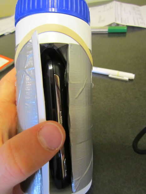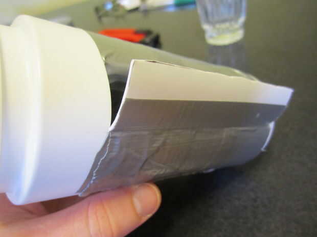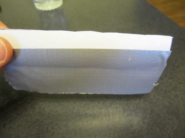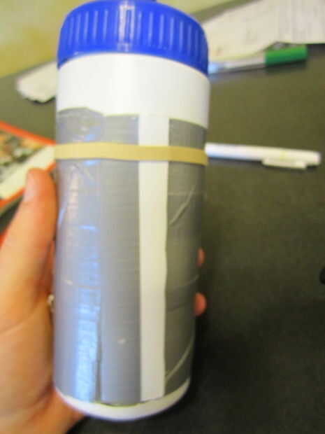 1) tomar la pieza de la botella de agua que guardó antes y corte un pedazo de cinta del conducto la misma longitud que él.