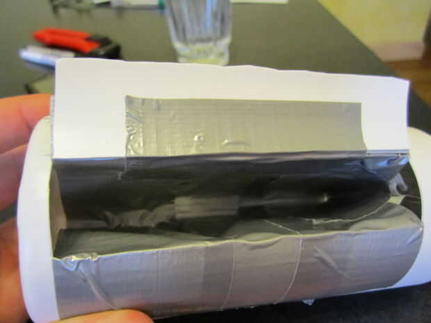 2) pegue el plástico a la abertura de la ranura por lo que es como una puerta. Usted puede poner un trozo de cinta en el interior de la puerta también.