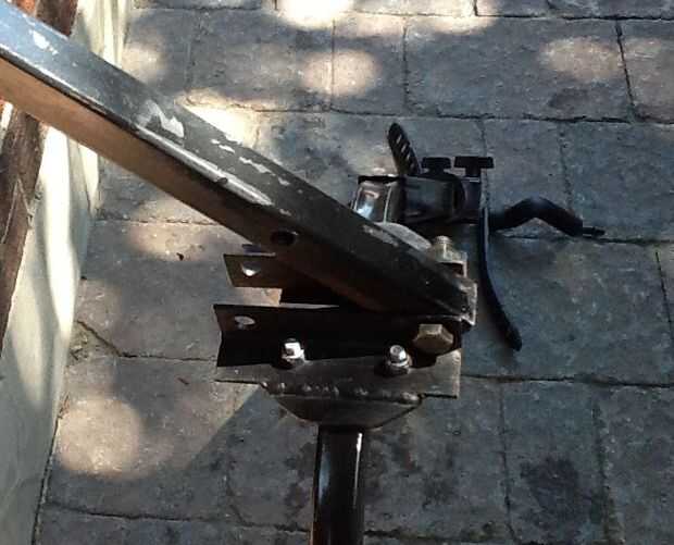 La nueva placa de montaje con un tornillo de tamaño adecuado, las arandelas y un Nyloc tuerca en el extremo del tubo y apretar hasta que se puede inclinar, pero es un poco rígido. Deslice el pasador de enganche en el orificio en el otro extremo de la placa de montaje y fije el clip de retención.