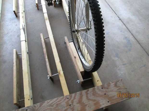 del remolque. Las vigas son de 10" a 12" aparte. Los neumáticos de la bici se sujetan en su lugar con una pieza de 1/2" por 4" Junta. Los orificios a través de las vigas de soporte y abrazadera juntas son de gran tamaño en 7/16" para compensar los agujeros no se perfora perfectamente recto. Mis pernos 3/8 son 5" de largo y tienen una tuerca de mariposa y arandelas planas en cada extremo. Puede que tenga tornillos de diferente longitud según el ancho de los neumáticos y el grosor del tablero.