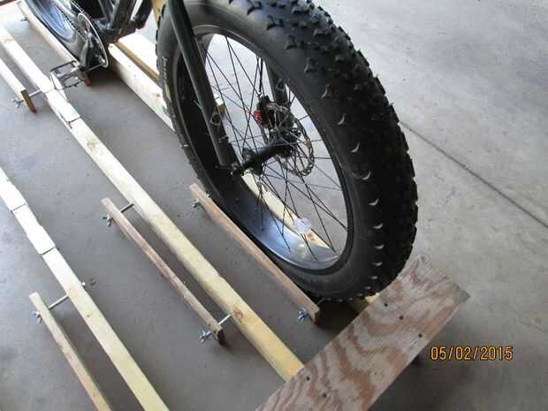 Uno de los lugares tiene 7" tornillos para acomodar la moto de grasa neumático. Al transportar la moto con los neumáticos más estrechos se utiliza una pieza de 2 x 4 como un espaciador. Ambos están en la foto.