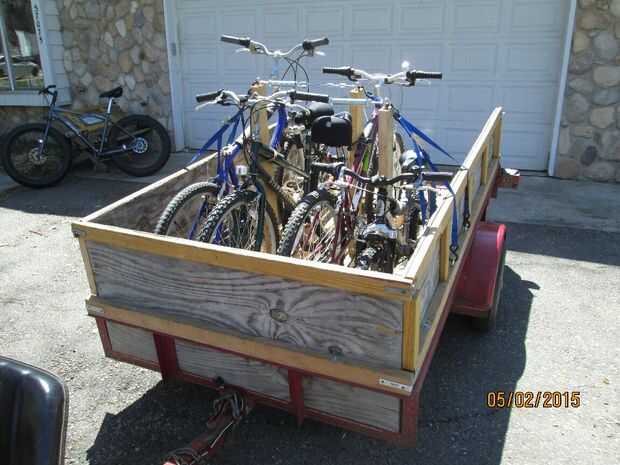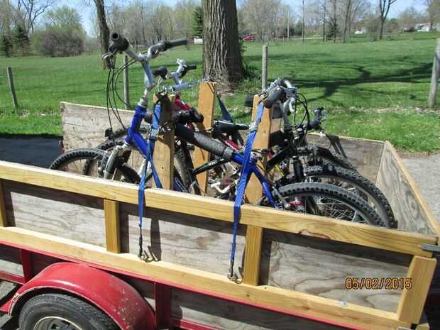 Observe que cada soporte vertical tiene un perno atornillado en la parte superior. Hay una primavera y poca longitud de cadena que conectan dos soportes verticales. Por esta razón los soportes verticales deben estar alineados. La primavera y la cadena están conectados entre sí y a los pernos de ojo usando clips de Carabineros fuerte. El otro extremo de los tirantes acople para remolque con armellas atornilladas en la aparadores de remolque. Los tirantes se tiró firmemente con alrededor de 50 libras de tensión. Los resortes mantienen las correas firmemente y permiten pequeños movimientos durante el transporte.