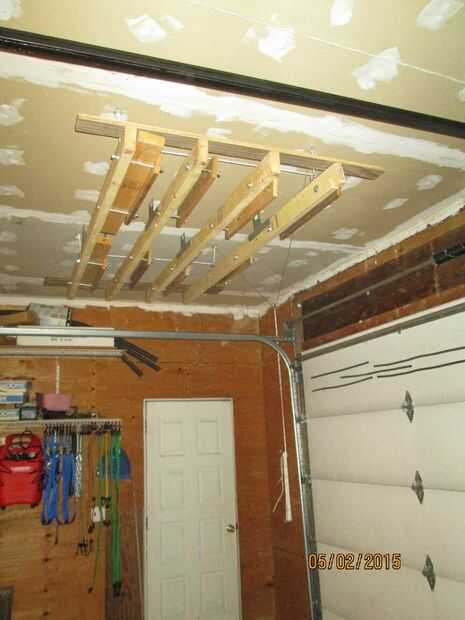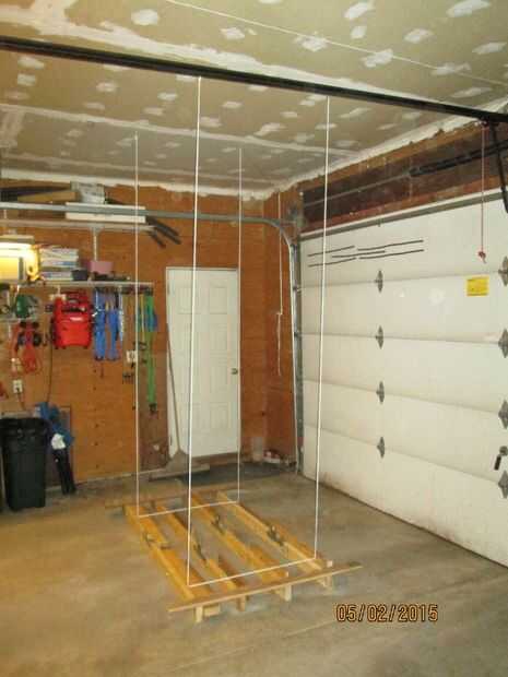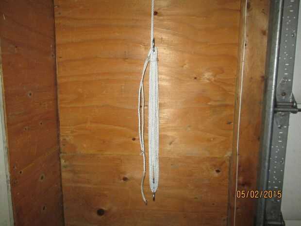 Cuatro pernos de ojo fueron instalados en postes de madera de techo. Luego cuatro ganchos pequeños fueron atornilladas en las vigas de la base de la parrilla la misma distancia aparte como el techo cáncamos. La cuerda fue dirigida a través de un quinto tornillo de ojo en la esquina del garaje. Dos perchas se instalaron en la esquina debajo de la armella quinto y utilizados para envolver la holgura en la cuerda cuando la cremallera se levanta.