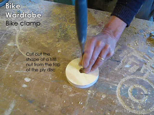 I cortar otro disco de la capa, perforó un agujero para un tornillo M8 y picado la forma de la tuerca en la parte superior.