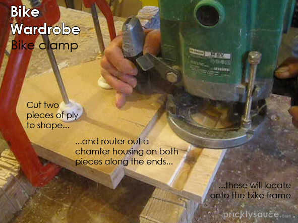 Corté dos piezas de encofrado de la capa y routered un chaflán plano de fondo de surco a lo largo de la anchura de ambas piezas cerca de la vanguardia, esto llevaría a cabo el marco de la bici.