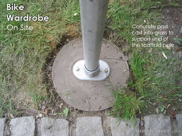Cavó un agujero y había hundido un balde viejo y rellenado con concreto para hacer un pie de almohadilla limpio para el poste de andamio final.