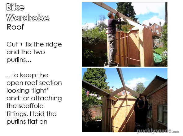 Hacer la cresta y las correas juntos [como lo haría normalmente vigas] ganzúa y tenoned un piso de madera en las correas y a la mitad articulado en la parte superior de la cresta.