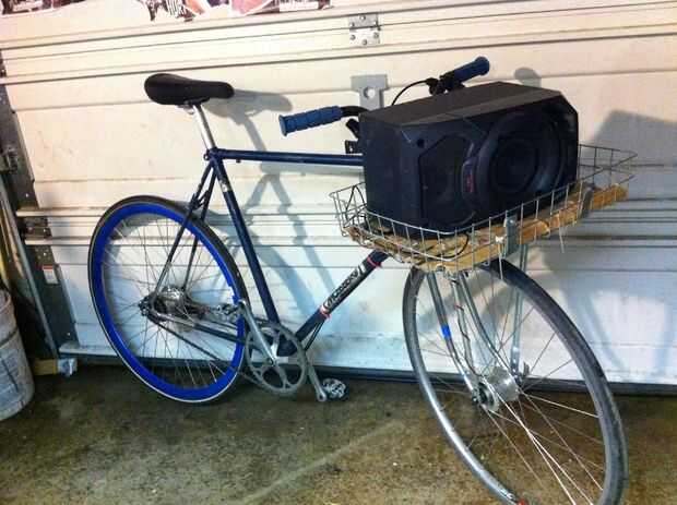 Totalmente es alimentado por un generador de dínamo del cubo... bicicleta completamente fuera de la red potencia 'caja de la diversión del.' Saca un montón de sonido de un altavoz scrapy... Ya tengo un altavoz de 2 vías de 8" en el correo del siguiente generación sistema de sonido... tan divertido tener voladura de sonido para arriba en usted en vez de a través de la oreja cogollos... mucho más seguro también!