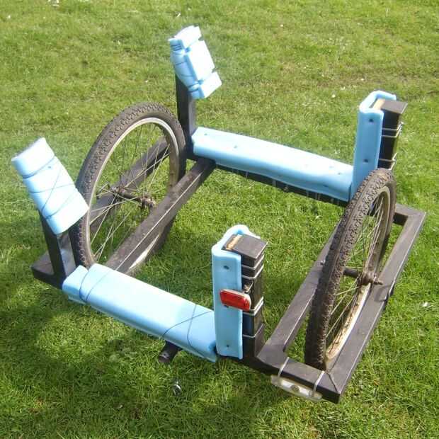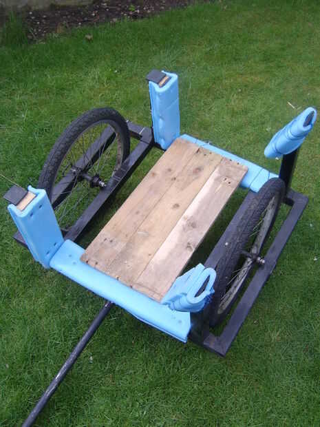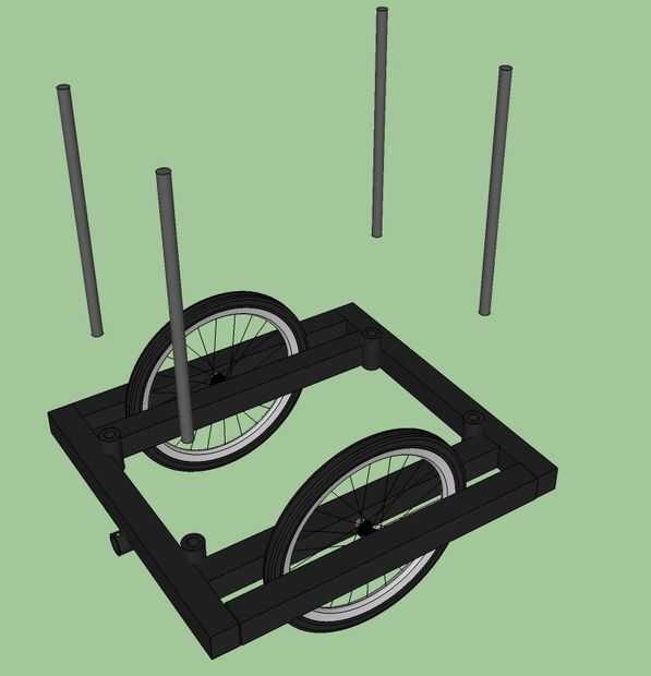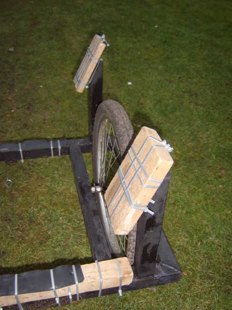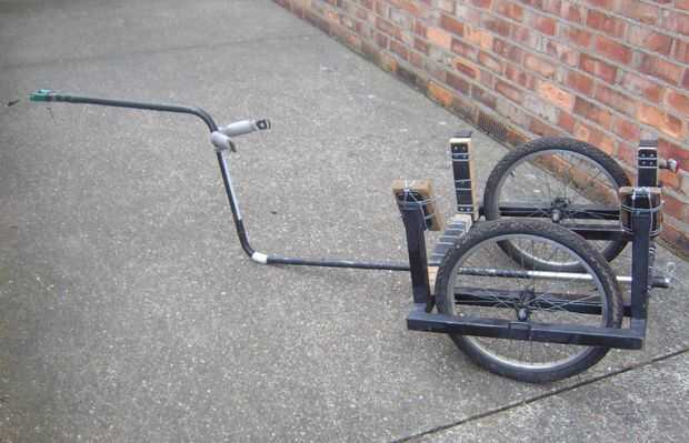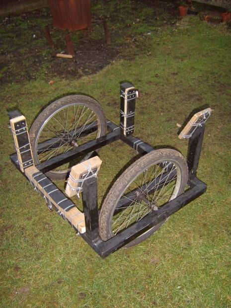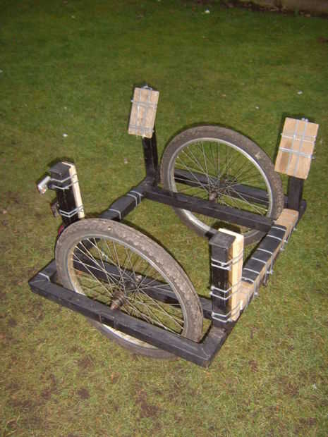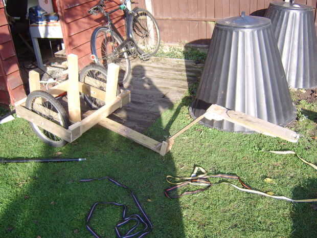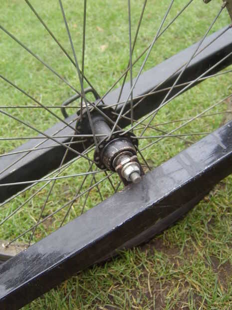 Las ruedas eran el problema más grande pero también más influyentes hacia el conjunto de este proyecto. Yo había considerado el uso de 'gordos', ruedas de carretilla tipo como ruedas de goma sólidas. Estos se habrían prestado a un remolque más ligero, más corto y generalmente más débil. Esto no fue un compromiso que estaba dispuesto a hacer para mi bici de cuando era cerca de diez sufrió la pérdida de sus ruedas de 20" y ahora sigue siendo sólo el marco. Fue un buen sacrificio me ha permitido hacer un trailer mucho más grande, más fuerte y resistente. He encontrado a realizar mejor un poco desinfladas para que tengan un poco de rebote; después de todo son la suspensión única de remolques.