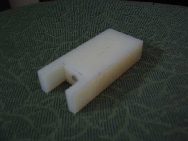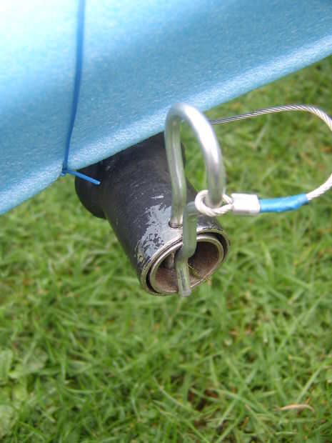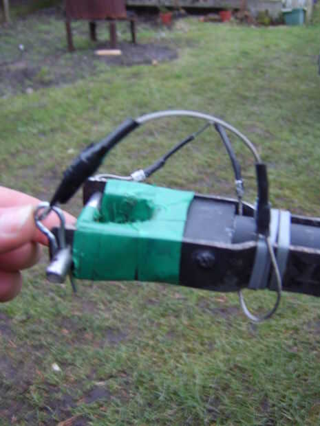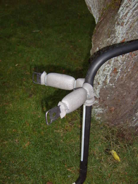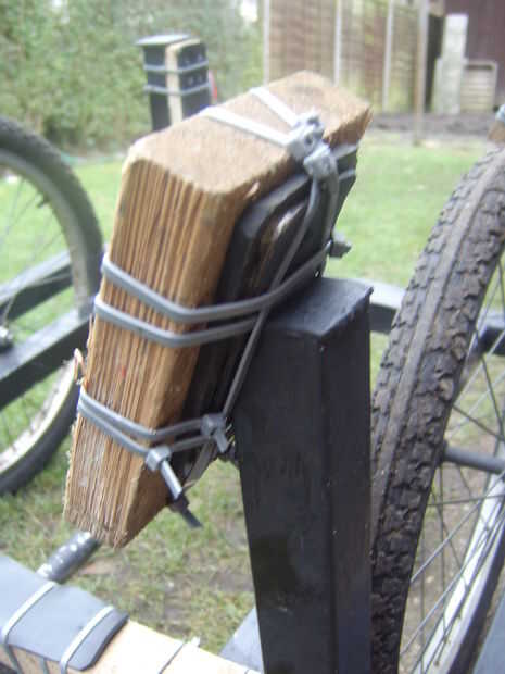 Dejé el enganche hasta el último. En Instructables otros vi una serie de ideas la mayoría de que conectado al lado de la rueda trasera. Esto me sorprendió ya que parecía poco práctico para la accesibilidad y curvas cerradas. Surgió la idea de clavar la lanza a dos tiras de acero inoxidable, que luego llevó a cabo un bloque de nylon en forma de ' U'. Esto encajaría en mi 1" Ø bicicleta asiento el tallo y el eje. Un pin a través de él 'completaría el círculo' que es completamente asegurado por otro pin. He encontrado este rápido y fácil de colocar o quitar especialmente en las noches oscuras de invierno.