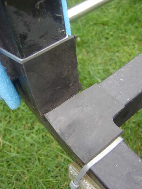 Pues mi uso principal del remolque para el transporte de mi barco, había diseñado la lanza y montantes (y su colocación) específicamente para caber mi kayak pero dejó una base plana para otros objetos transportados en ella. La forma natural de mi kayak (un playboat) significado se sentó en un ángulo tan para un transporte seguro y e incluso la propagación de peso tendría que hacer a un lado de montantes en ángulo. Tenía 1' de la sección de caja en cada esquina ya así que usando una amoladora cortar en un ángulo y soldado con autógena en placas para ella sentarse en. Entonces agregué caucho acolchado y más adelante (después de ensanchar el marco) bloques de madera para ocupar el espacio extra.