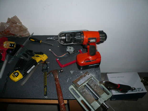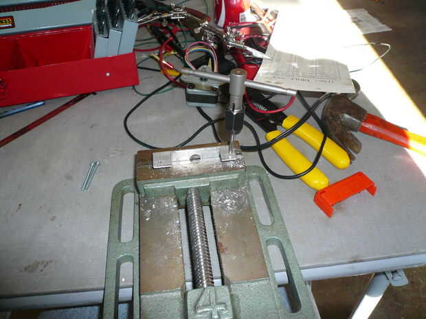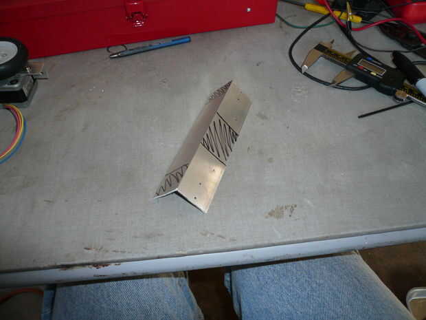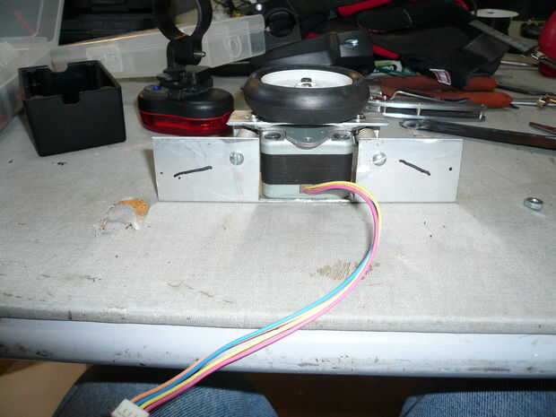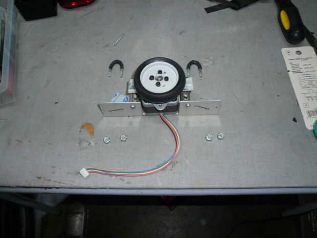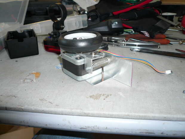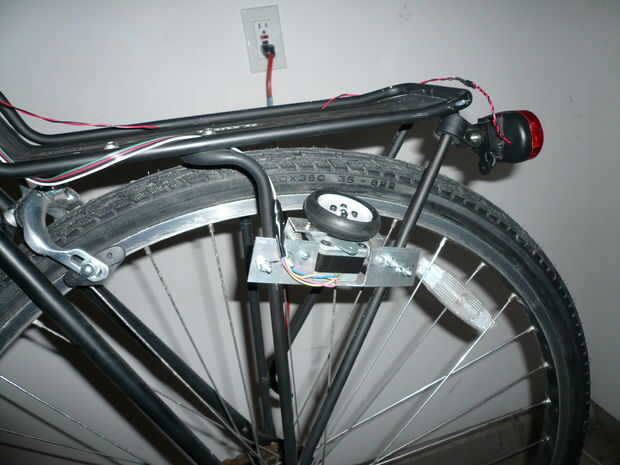 El ángulo de aluminio de 3/4" fue hecho para montar el motor que se hizo el 1-1/4" de aluminio para montaje en rack. Estas dos partes son conectadas juntos por los dos tornillos #6-32 y dos resortes. La rosca de los tornillos en los agujeros roscados en el montaje del motor con los muelles alrededor de ellos. Esto permite que el motor mover el borde le. Esto asegura que la rueda del generador está siempre en contacto con rim. El tornillo #6-32 fue utilizado para hacer dos pernos en U. Se ajustan el tamaño de las barras en la parrilla.