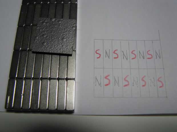 En la imagen de arriba se puede ver cómo debe ser el camino de la polaridad magnética de los imanes, los polos norte y sur deben ser tablero de ajedrez de tipo alterna.