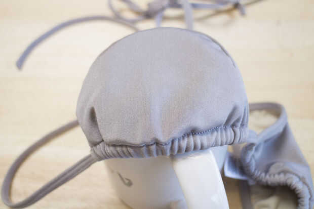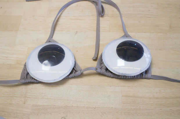 Utilizando fabritac, pegado abajo de los ojos saltones al centro de cada copa del bikini.
