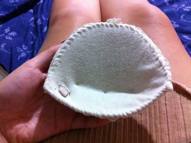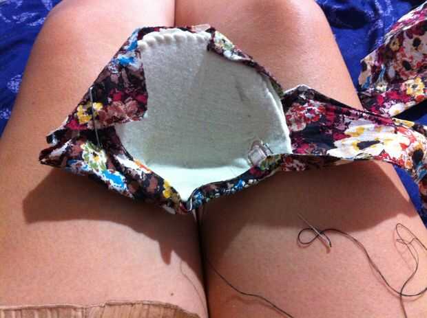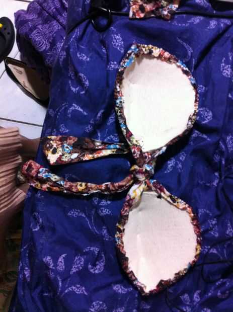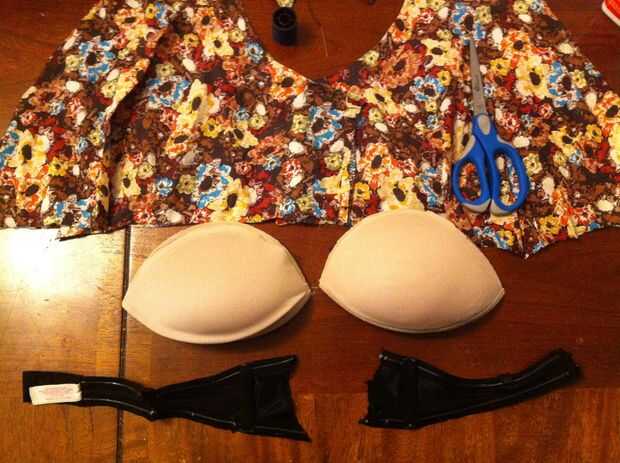 usé un vestido viejo y rellenos de sujetador. Primero cosí el forro en el interior de dos piezas acolchado entonces el patrón floral en el exterior con las cuerdas hacia el centro hasta un ser atados juntos.