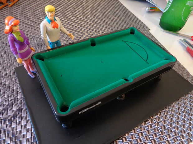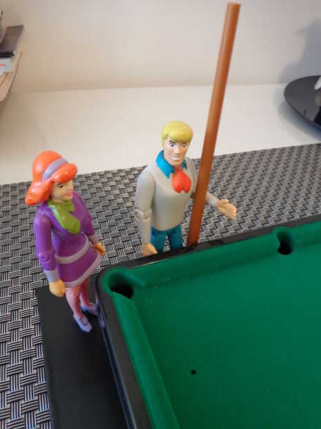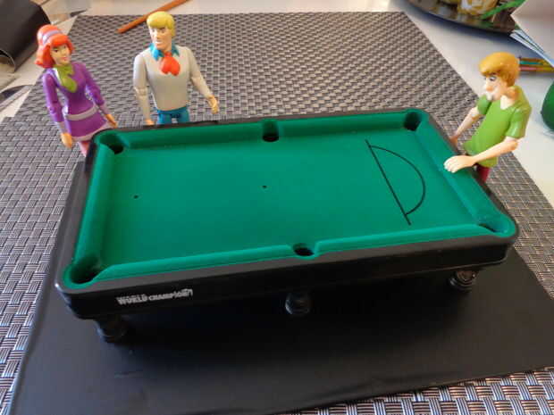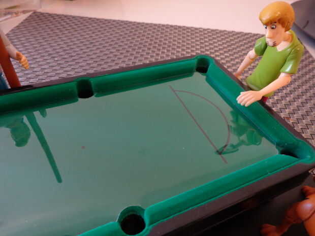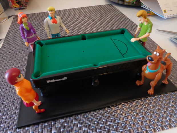 me fijo entonces todos los caracteres a la Junta y cerca de la mesa, buscando un ajuste apropiado. Fred y Daphne (obviamente) tenían que estar juntos, y Fred debe sostener un taco de pool. y parecía apropiado para alguien que probablemente se estaba preparando para un tiro - desastroso, "Joroba" de Shaggy. Scooby-Doo y Velma el conjunto completaron.