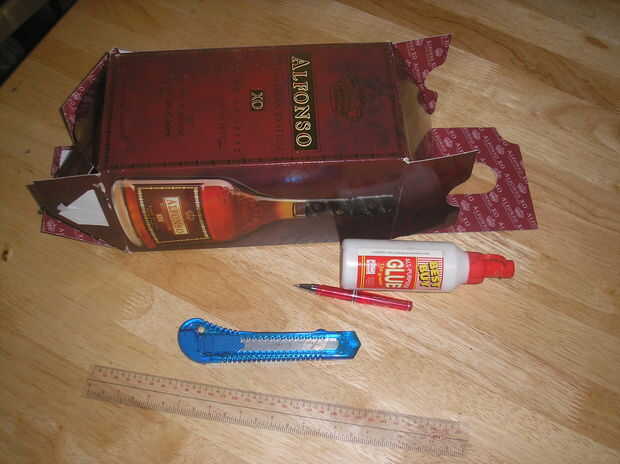 En este proyecto he utilizado: una caja de brandy (puede utilizar otras cajas similares... cajas de johnnie walker son ideales para esto) un cortador o cualquier cosa que usted utilice para cortar telas pegamento o adhesivo mejor clips o abrazadera