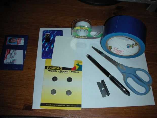 Materiales necesarios: -Cinta -hoja de papel -cinta scotch -imanes finos -fina cartulina -Tarjeta de crédito USB tarjeta de memoria flash -tiempo de matar