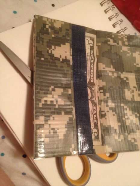 Ahora Ataremos los bolsillos! Primero el bolsillo de dólares! He añadido en la cinta de jean para el detalle! Usted también querrá así que los bolsillos pequeños. Ahora para unir pequeños trozos de cinta adhesiva transparente. Agarrar la cinta y coloque el dólar en la base. Ahora agregue un poco de camuflaje sobre la clara que queda. Tiempo para las ranuras de tarjeta de visita!