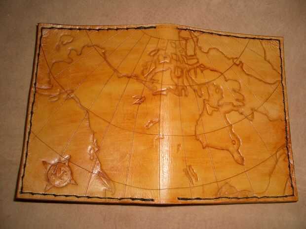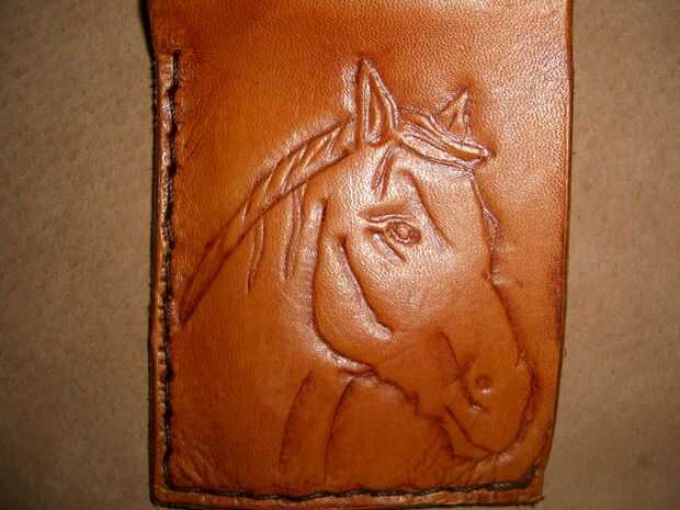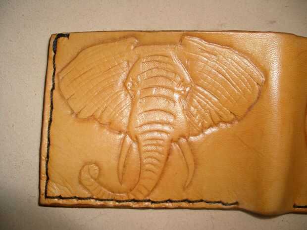 Ahora que su cartera está buscando como una cartera funcional, puede aplicar un colorante si quieres. Me gusta aplicar sólo una capa muy ligera de manchas solubles en agua, para que el color natural y el grano de la piel no es eclipsado. Algunos artistas sugieren aplicar una capa generosa y limpiando el exceso, pero me gusta aplicarla con una esponja o cepillo. Esto agua abajo de la mancha y acentuar los puntos bajos de herramientas. Experimento, como no hay reglas. El elefante, el mapa y el caballo en este paso fueron manchados con la misma botella, utilizando diferentes técnicas.