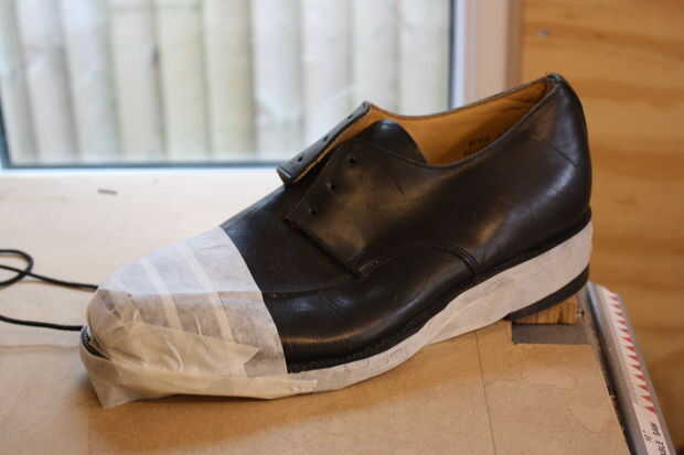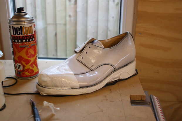 Primer paso fácil. Enmascare los zapatos y rociarlas blanco, aparte de los dedos del pie. Este año quiero probar hacer todos mis proyectos de poco recién había comprado cosas como sea posible, así que acabo de recibir los zapatos viejos de la tienda de caridad con una suela dura.