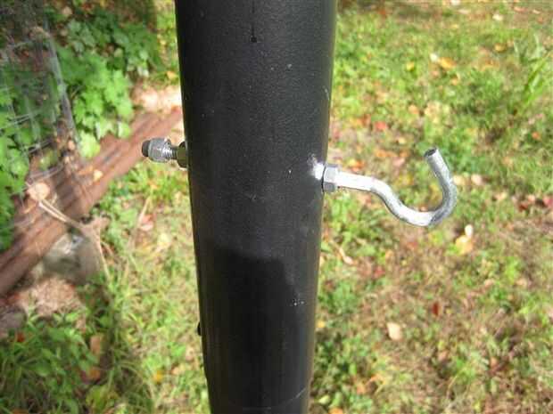 Hilo de rosca de una tuerca en primero en paños línea gancho, luego poner a través de la tubería y asegurado con la otra tuerca. Esto hace más fácil ajustar la distancia del gancho de la tubería - además hace una conexión más fuerte.